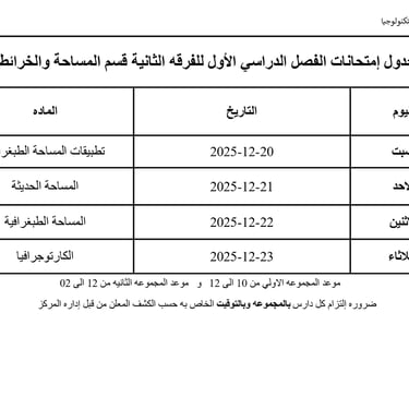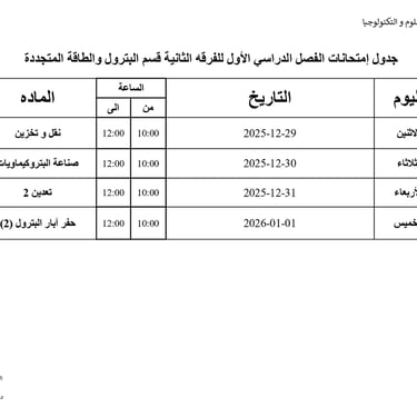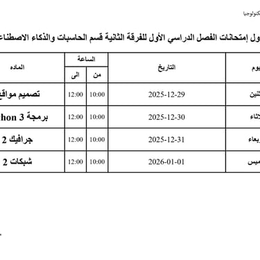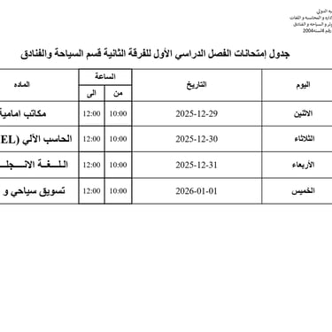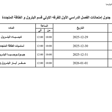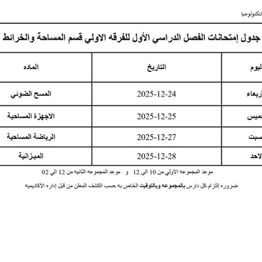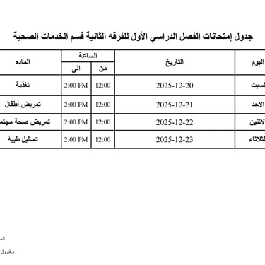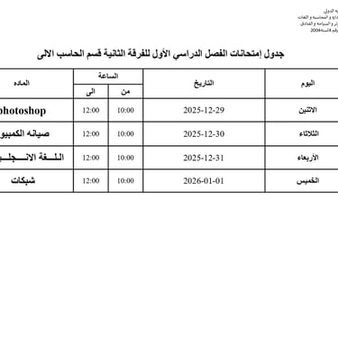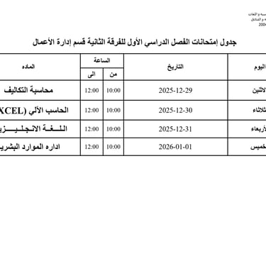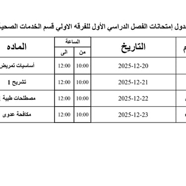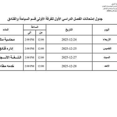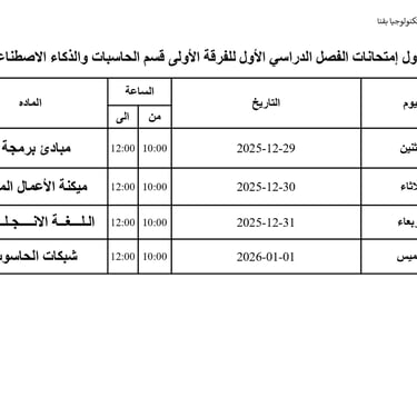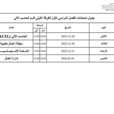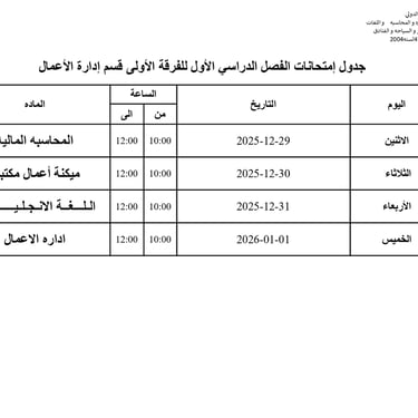جداول امتحانات الفصل الدراسي الأول لجميع الأقسام للعام الدراسي 2026/2025